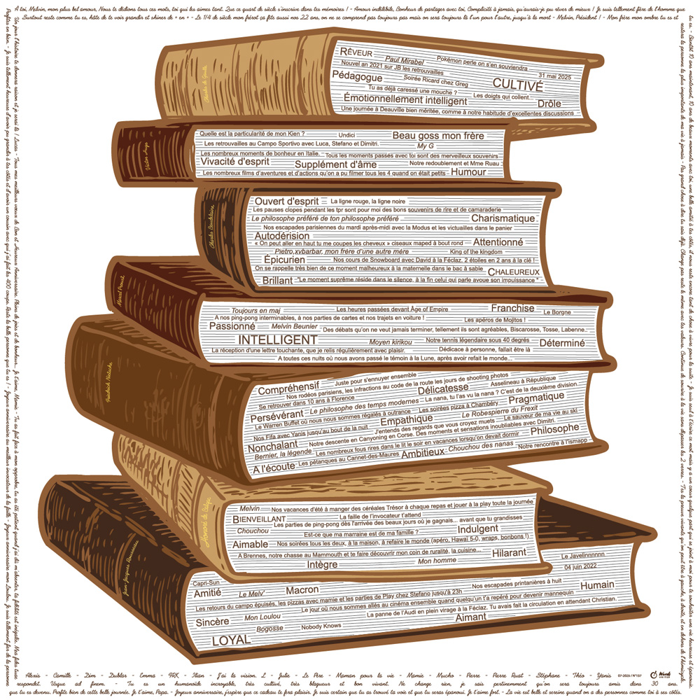They have already been produced by Bouquet de Mots and are based on a theme: the mountain, the sea, the classical guitar, the electric guitar, the cello, the fado, the horse, the planets, the atom, the tree, the little prince, rugby, the star, mickey, the dragonfly, the dog, works, golf, windsurfing, tennis, yin yang, the thinker…
